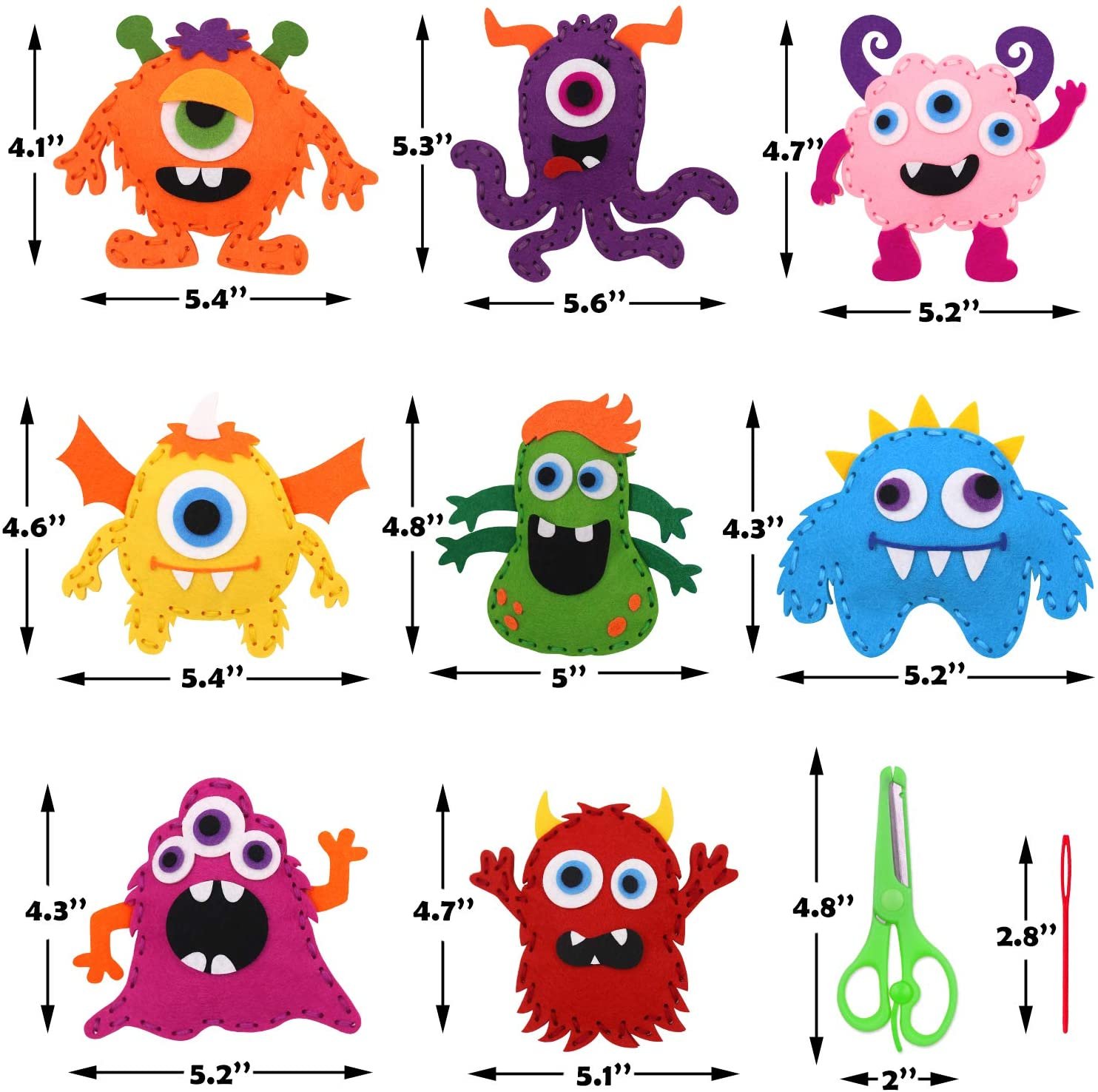 Kit includes: pre-cut monster felt pieces, 1 child-safe plastic needle, yarn, soft cotton stuffing, and easy-to-follow instructions.